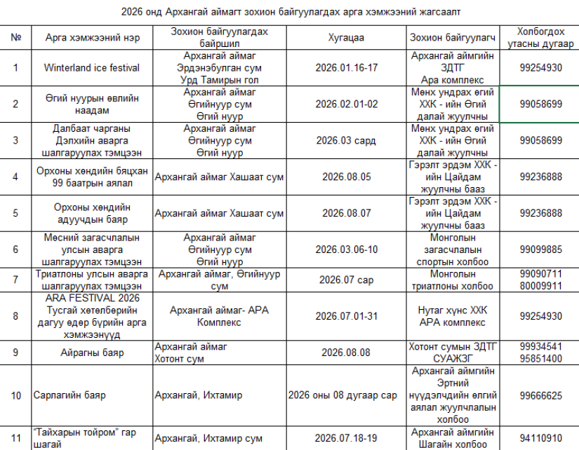 Энэ онд мөн л тов тодорхой аялал жуулчлалын эвэнтүүд болно. Дор хүснэгтээр харуулъя.